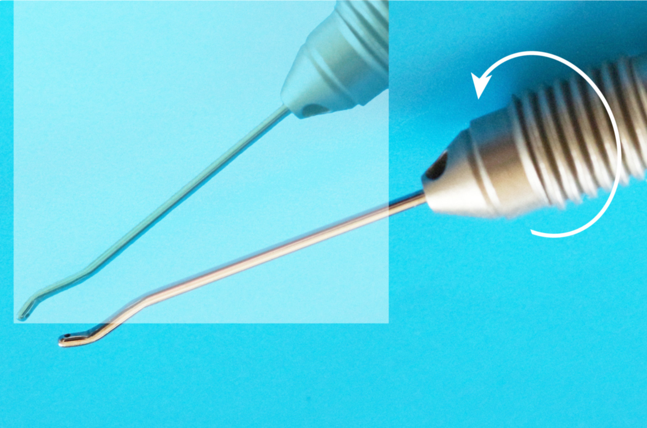 22ゲージ I/Aハンドピースtakahashiモデルは、 カニューラ(直)とカニューラ(曲)の両モデルの使用法を兼ねる。つまり通常は吸引ポートを上に向けた従来どおりの使用法ができ、ハンドピースを180度回転すれば、12時部の吸引し難い残留皮質をたちまち吸引す。